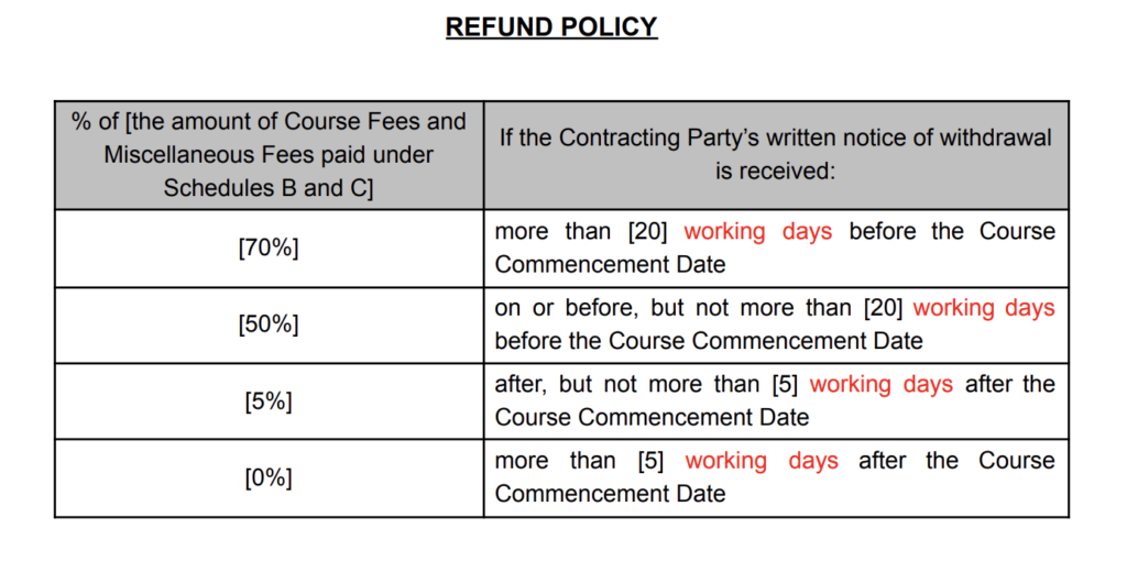 The Student shall be informed in writing of alternative study arrangements (if any), and also be entitled to a refund of the entire Course Fees and Miscellaneous Fees already paid should the Student decide to withdraw, within seven (7) working days of the above notice.